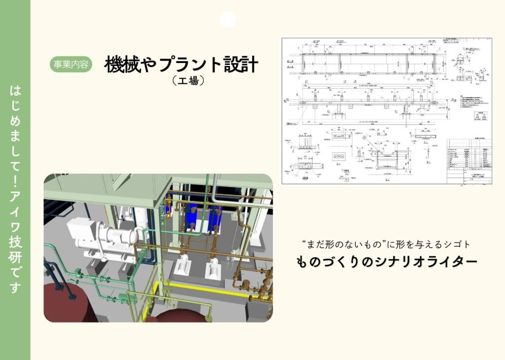 主な事業内容アイワ技研は、ものづくりのスタート地点ともいえる「図面づくり」を中心に、さまざまな機械や設備の設計を行っている設計会社です。