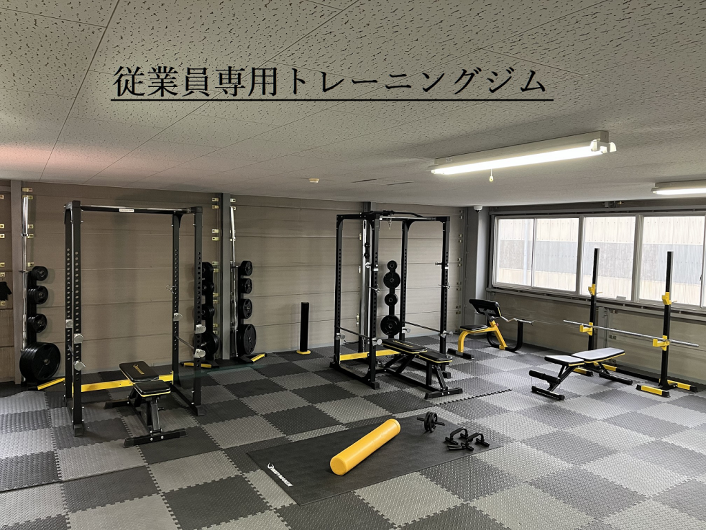福利厚生健康保険、厚生年金保険、雇用保険、労災保険、退職金制度、育児・介護休暇、産前産後休暇、資格取得支援、資格手当、住宅手当、家族手当、奨学金返還支援、祝い金(結婚・成人・勤続周年)、作業着支給、従業員専用ジム完備、クリスマスケーキ半額補助